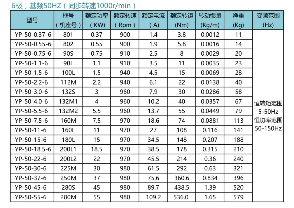 YP變頻系列6極型號(hào)