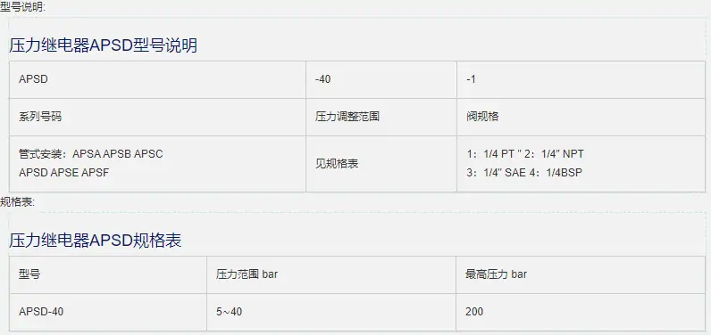壓力繼電器APSD有如下型號:APSC-40-1,APSC-40-2,APSC-40-3,APSC-40-4。