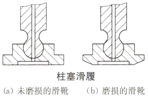 為了延長(zhǎng)液壓油泵的使用壽命,必須定期在油路的紊流處取出油樣檢驗(yàn)。保持油液的清潔度是系統(tǒng)維護(hù)保養(yǎng)的重要內(nèi)容,有時(shí)系統(tǒng)不能正常運(yùn)行,就是因?yàn)榭刂崎y閥芯被油污卡死,或產(chǎn)生阻尼、運(yùn)動(dòng)不暢。出現(xiàn)故障時(shí)又找不著其他原因,則清洗相關(guān)的控制閥(特別是比例閥)是重要的措施。軸向柱塞泵的損壞是從柱塞滑靴的磨損開(kāi)始的,如下圖所示。當(dāng)滑靴磨損到不能形成與斜盤(pán)間的靜壓油膜時(shí),則滑靴與斜盤(pán)間的摩擦力增大,斜盤(pán)被拉傷,摩擦力進(jìn)一步增大,回程盤(pán)破裂,泵的內(nèi)部損毀,所以定期將磨損(還未完全損壞)的滑靴換掉就可以避免整泵的損壞。