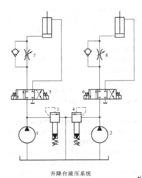 某工廠生產(chǎn)的設(shè)備安裝升降臺(tái)液壓系統(tǒng)如下圖所示,用雙泵雙回路控制兩個(gè)頂升液壓油缸,實(shí)現(xiàn)雙缸同時(shí)動(dòng)作或單缸動(dòng)作。兩個(gè)同路對(duì)應(yīng)的液壓元件規(guī)格相同,管路通徑相同。